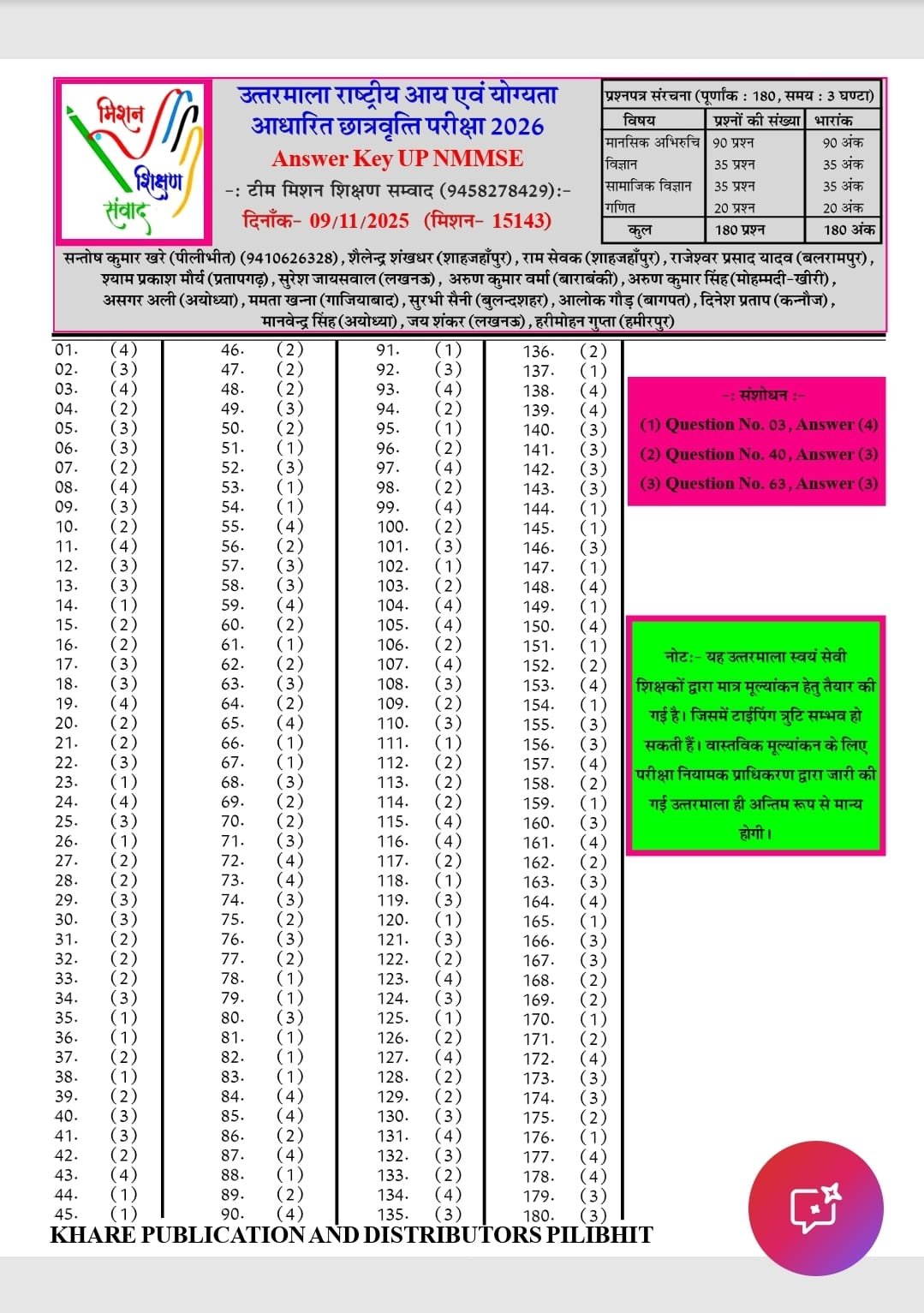 राष्ट्रीय आय एवं योग्यता आधारित छात्रवृति परीक्षा 2026, 09 November 2025 को आयोजित परीक्षा की उत्तर माला Answer Key (Unofficial)